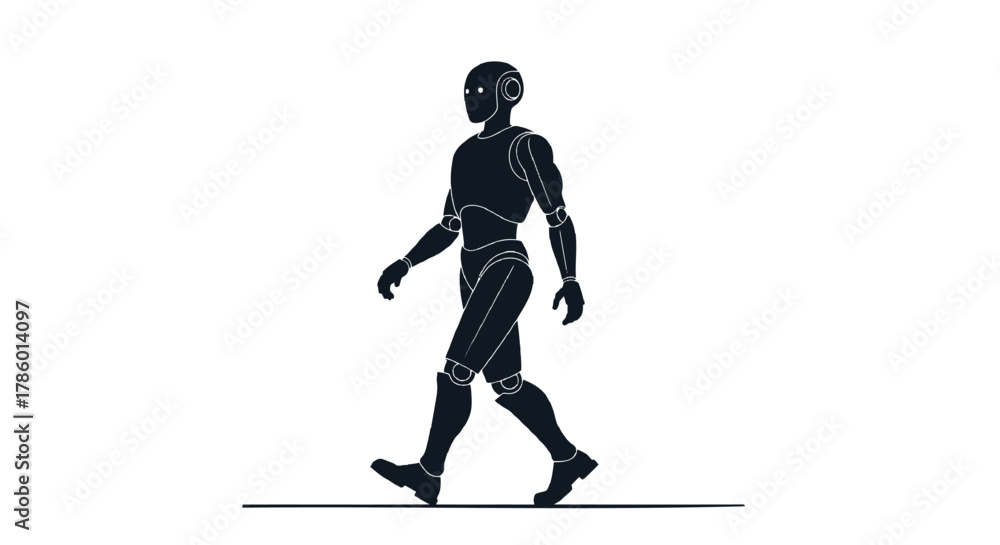 Silhouette of a humanoid robot walking forward on a white background with a clean minimalist design #1786014097