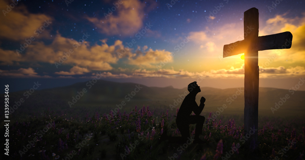 Silhouette of a man praying in front of the cross on a meadow with moving clouds #1339585406