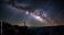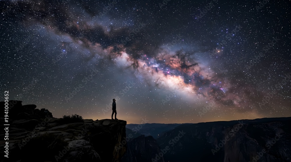 Silhouette of a man standing beneath a vast star filled sky and galaxy, expressing philosophical contemplation, human existence, cosmic perspective and reflection on life and the universe #1941000652