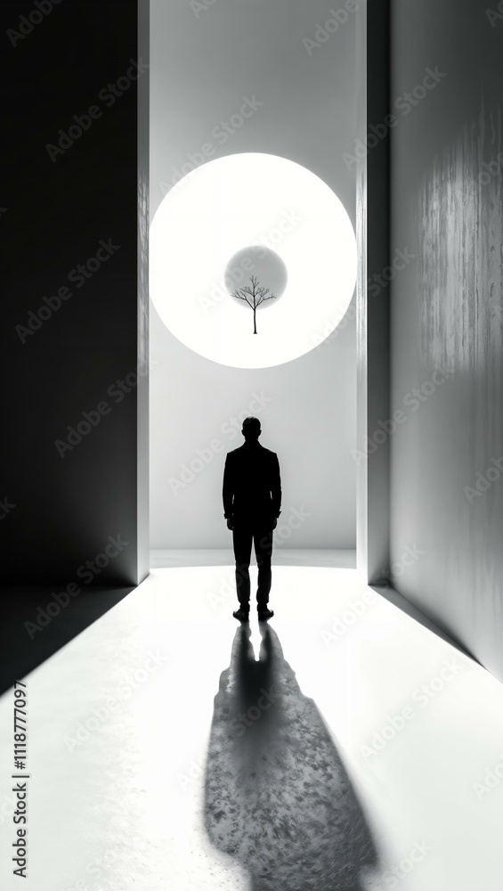Silhouette of a Man Standing in a Minimalist Space with a Tree in a Sphere and Dramatic Lighting #1118777097