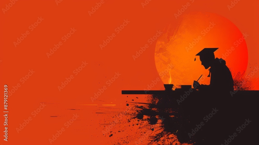 Silhouette of a person in a cap and gown sitting at a table with a large orange sun in the background. #879121369