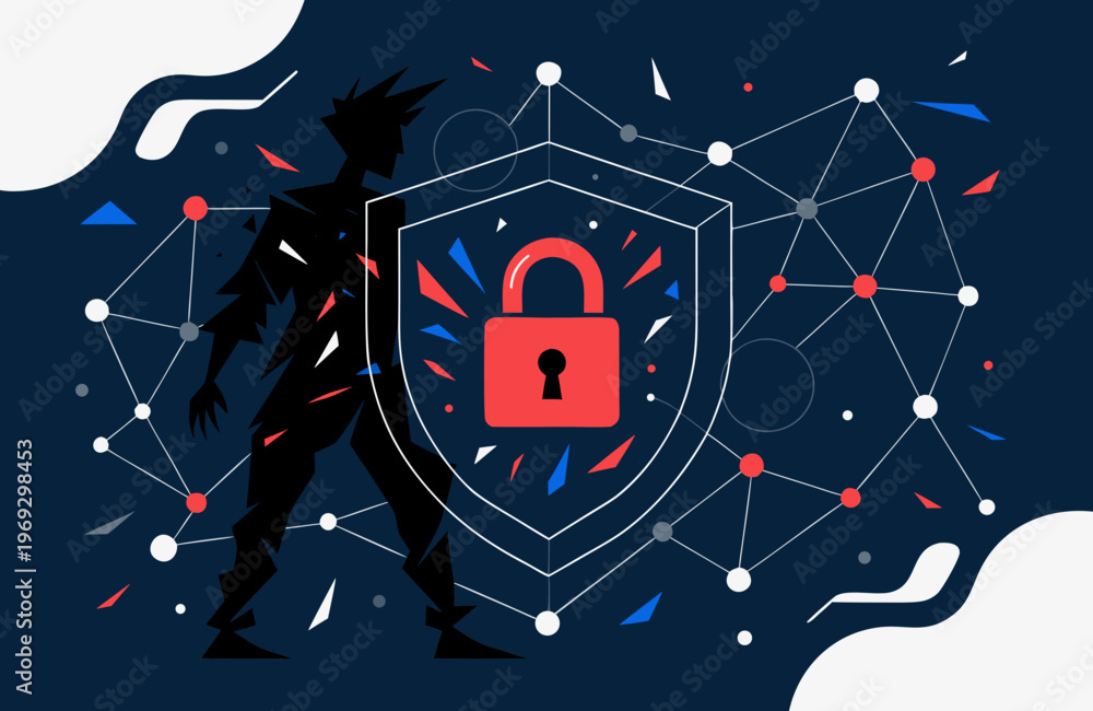 Silhouette of a person stands guard, protecting a glowing shield with a red padlock against a backdrop of a digital network and abstract shapes, symbolizing digital security and cyber defense. #1969298453