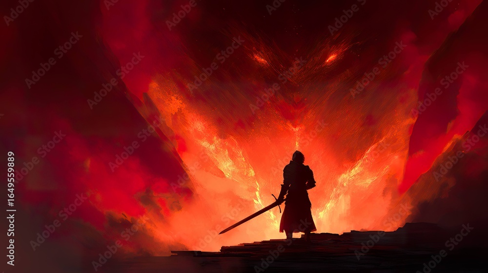 Silhouette of a warrior facing a fiery demon #1649559889