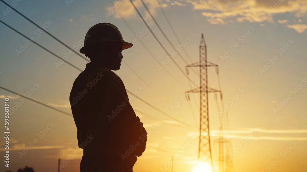 silhouette of lineman in helmet stands against sunset, showcasing dedication and hard work in energy sector #1396381910