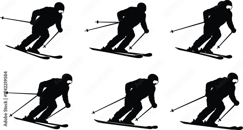 Silhouette of skier performing downhill skiing with poles, winter sport athlete in motion, extreme snow slope skiing vector illustration art #1742219584