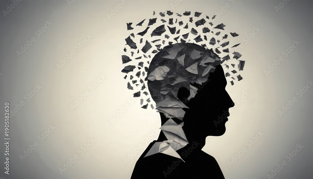 Silhouette of troubled person head. Concept image of anxiety and negative emotion. Waste paper and head silhouette. #1905182630