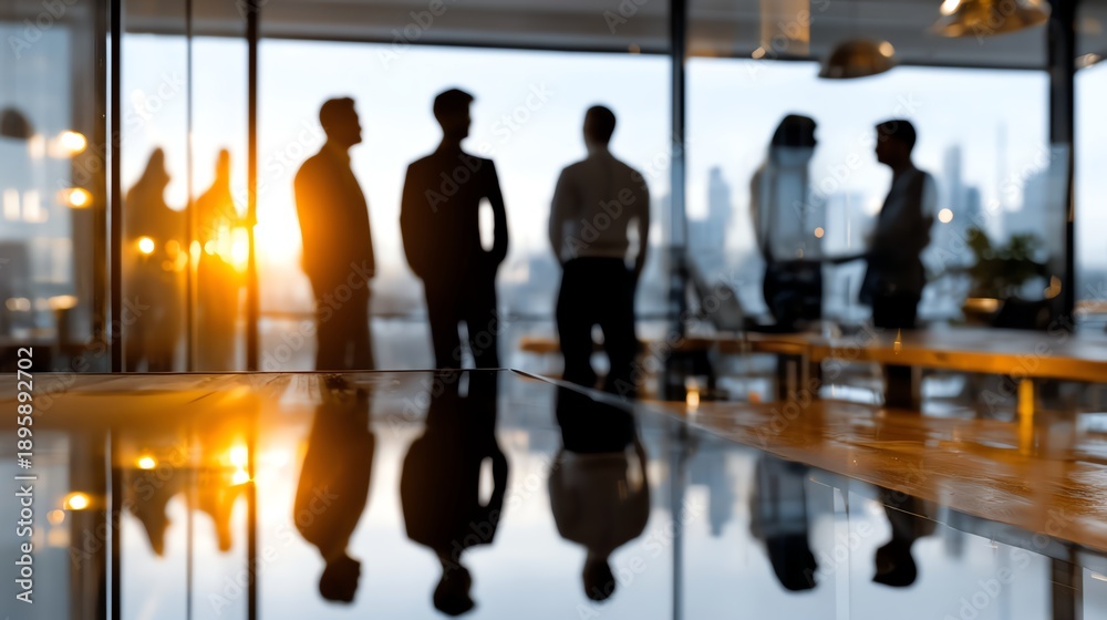 Silhouette of Visionaries: A group of business people, their forms silhouetted against a panoramic cityscape. They stand in contemplation, evoking a sense of forward thinking and strategic planning. #1895892702