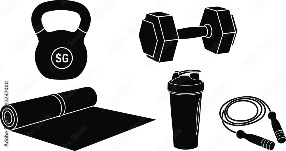 Silhouette vector set of 5 gym accessories kettlebell dumbbell yoga mat protein shaker bottle and jump rope #1913247000