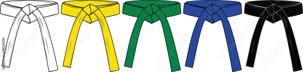Silhouette vector set of 5 martial arts belt ranks white yellow green blue and black belt tied knots #1913247210