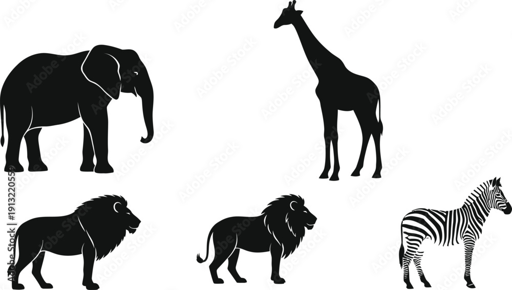 Silhouette vector set of 4 safari animals elephant giraffe lion and zebra side view #1913220559