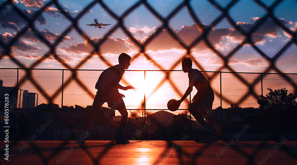 Silhouetted Urban Basketball Game at Sunset #860578283