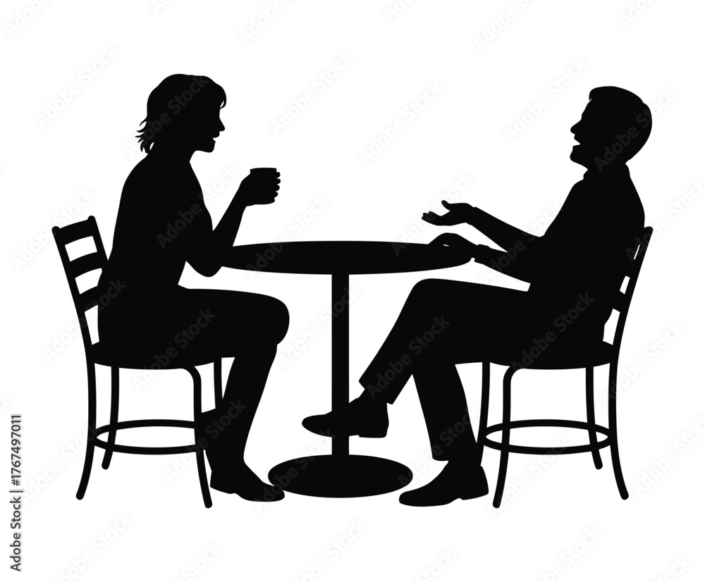 Silhouettes of a man and woman sitting at a table talking and gesturing #1767497011