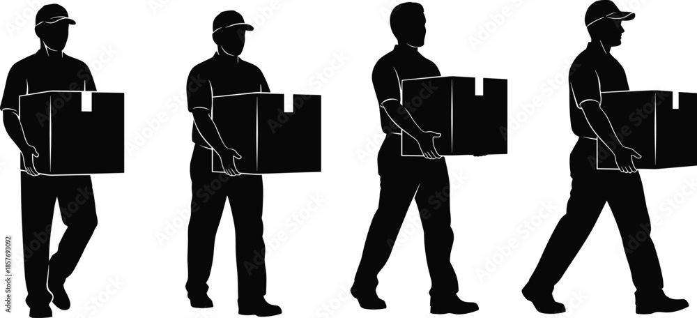 Silhouettes of Delivery Men Carrying Cardboard Boxes on White Background Keywords: delivery, man, person, silhouette, box #1857693092