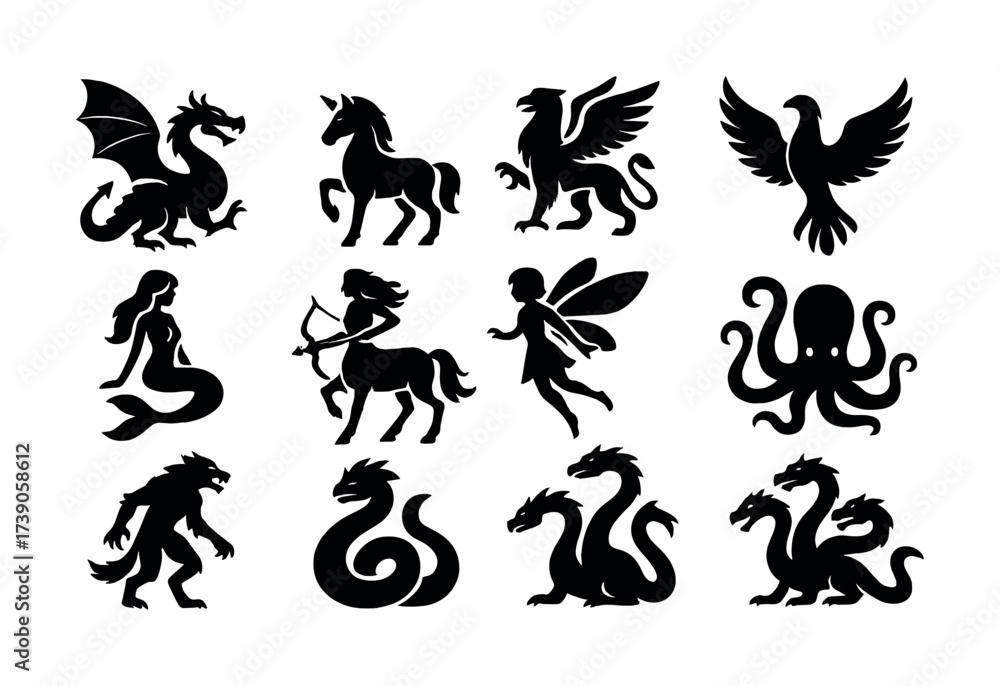 Silhouettes of mythical creatures: dragon, unicorn, griffin, phoenix, and more #1739058612