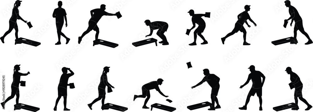 Silhouettes of People Playing Cornhole Game in Various Poses on White Background vector illustration #1928979245