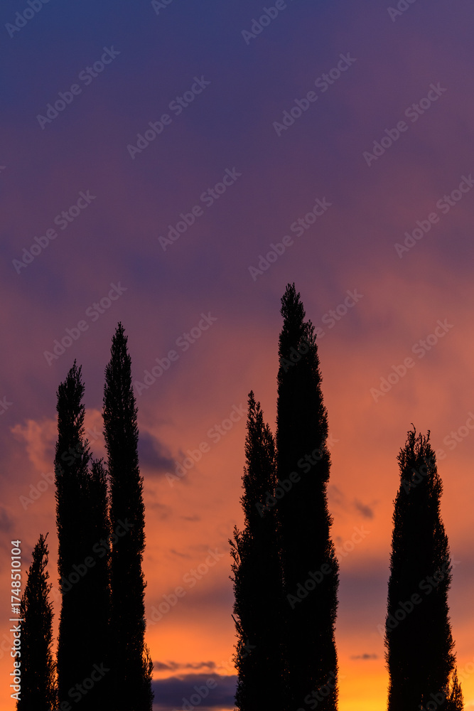 SILUETAS DE CIPRESES EN UN COLORIDO ATARDECER #1748510104