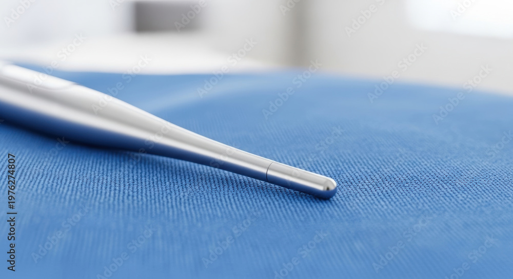 Silver medical thermometer probe on blue surgical gown close up macro clinical tool bright interior lighting #1976274807