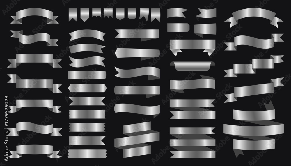 Silver ribbon elements. Decorative gradient ribbon banners, elegant bow icons, luxury awards and labels for celebration design. Vector isolated set #1779529223