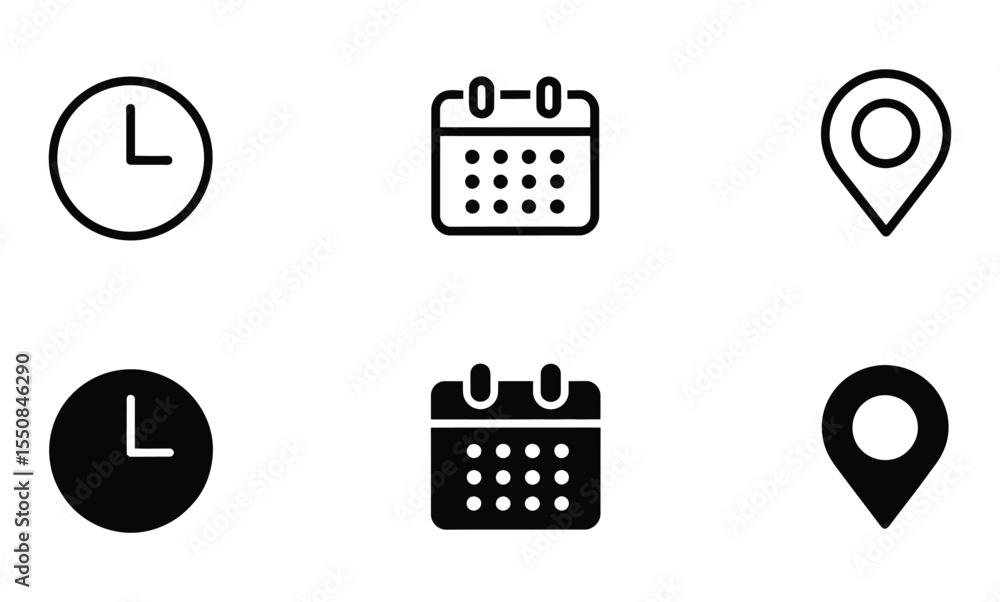 Simple Black and White Time, Calendar, and Location Icons for UI and Apps#1550846290