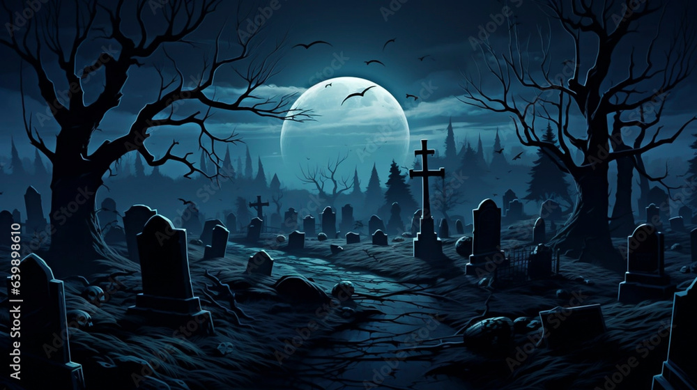 Simple Halloween background with dead trees at both sides. Creepy, spooky graveyard during night.. The moon is shining. Bats are flying in the air. Many gravestones. #639898610