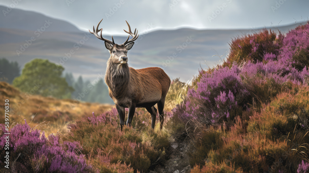 Single beautiful male redstag standing in the middle of blooming heather plants in the scotish hills. Generative AI. #589770830
