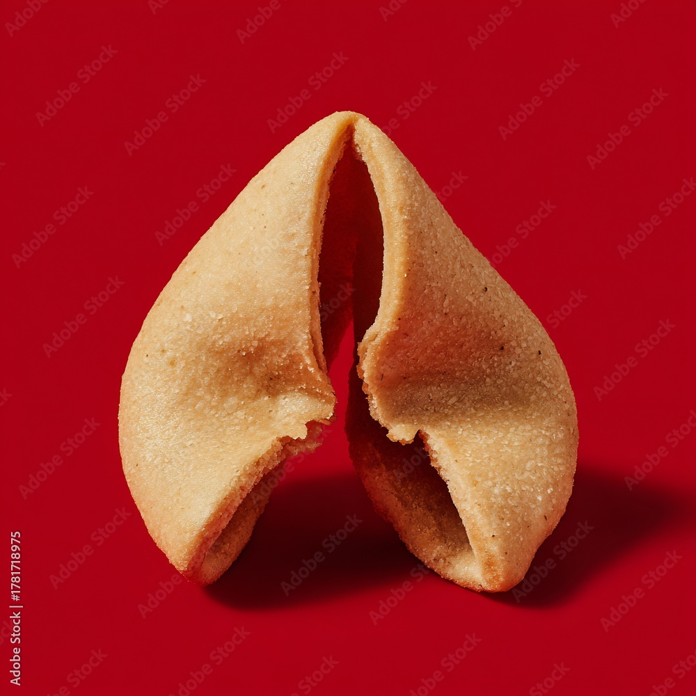 Single fortune cookie with a modern minimalist design cracked neatly in half the fortune strip visible isolated on a plain red background #1781718975
