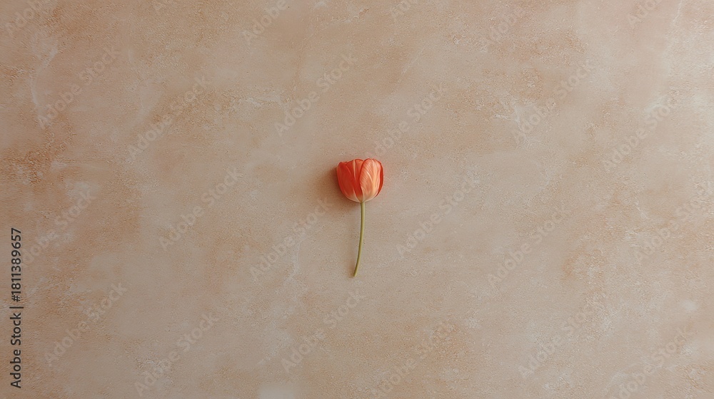 Single Orange Tulip, Minimalist on Textured Beige Background, Top View, Copy Space #1811389657
