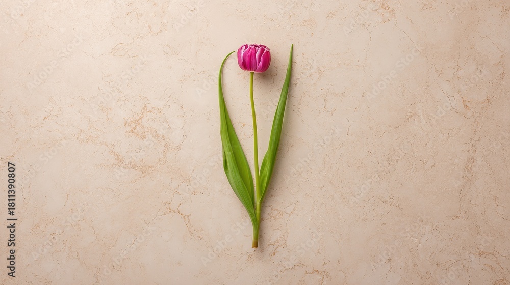 Single Pink Tulip with Green Leaves, Minimalist on Textured Beige Background, Top View, Copy Space #1811390807