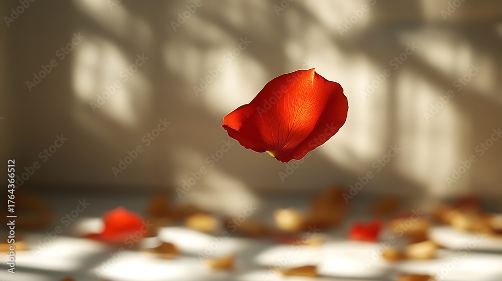 Single red petal floating above surface with scattered petals around it #1764366512