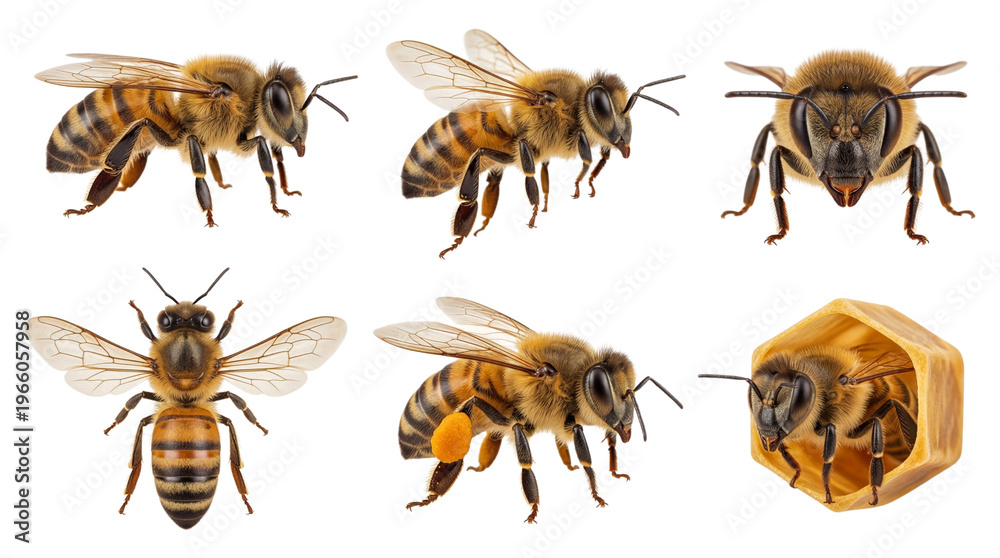 Six detailed honey bee photos showing multiple poses, close-ups and a bee in a hive cell on a transparent background #1966057958