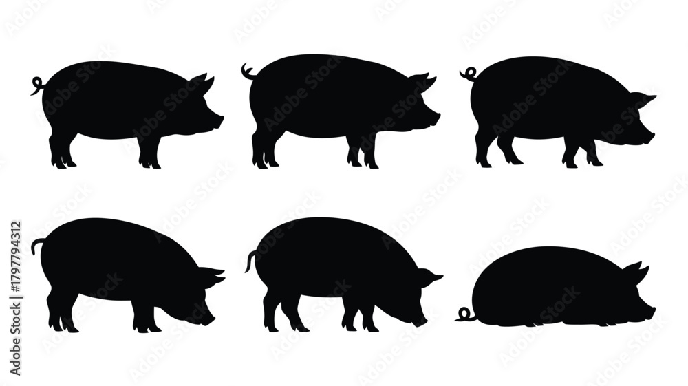 Six distinct black pig silhouettes showcasing different poses and movements, perfect for farm or agricultural themes #1797794312