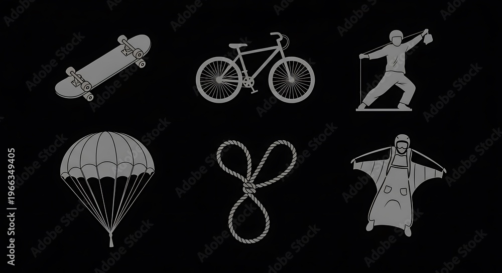 Six gray icons of recreational equipment against a stark black background #1966349405