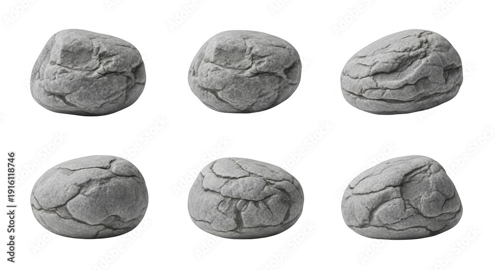 six gray stones in different angles on a white background useful for texture design or background elements #1916118746