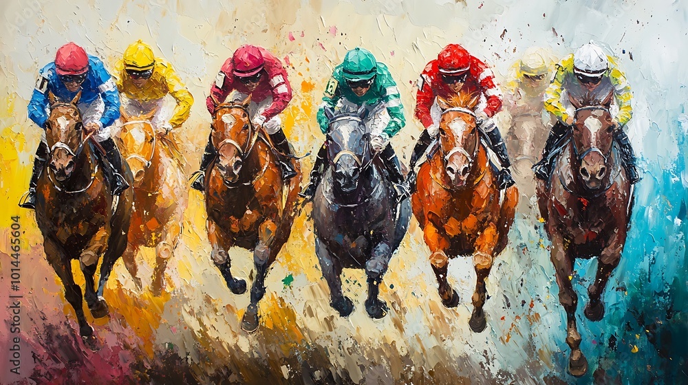 Six Horses in a Painting Racing Toward the Finish Line. #1014465604