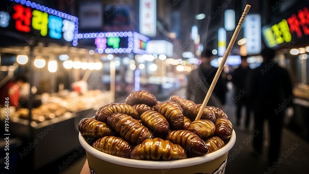 Sizzling Street Food Temptation: A close-up view of a paper cup brimming with silkworm pupae, skewered and ready to tantalize taste buds, amidst the bustling backdrop of a vibrant street food market. #1976465486