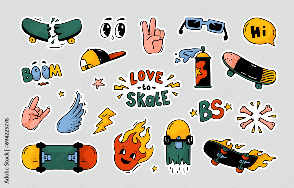 Skate stickers. Cool skateboard sport. Street skater prints for summer T-shirt. Board with art quote patches. Skateboarding labels. Trendy badges design set. Vector graphic illustrations #694225778