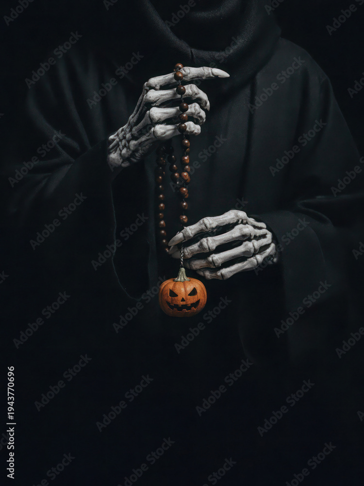 Skeleton hands in black hooded robe holding dark prayer beads with small carved Halloween pumpkin jack-o-lantern. #1943770696