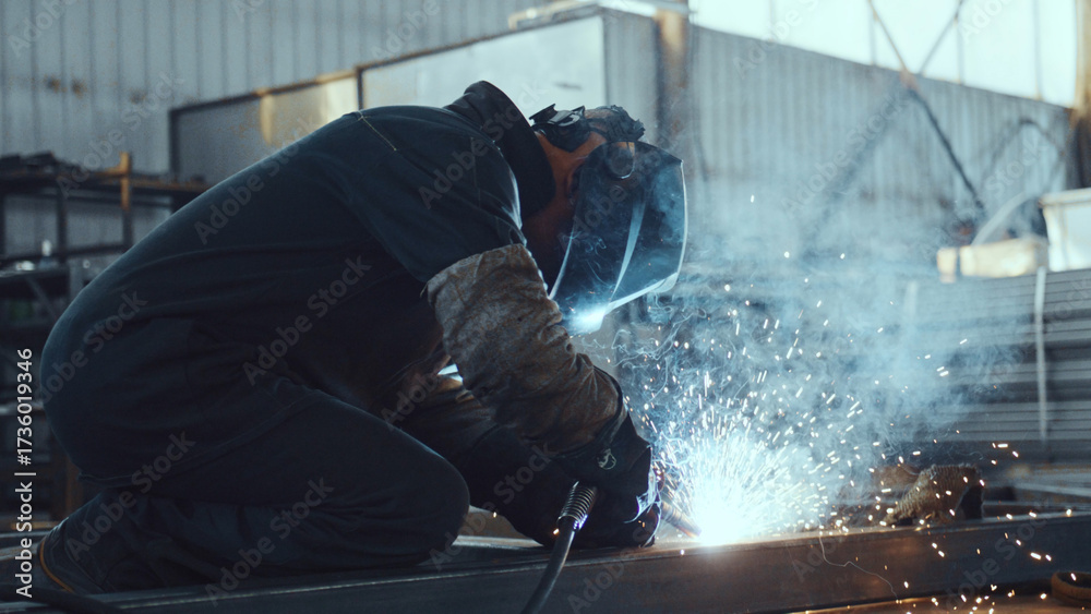 Skilled industrial worker performing arc welding on metal structure at manufacturing plant, creating bright sparks and smoke, signifying dedicated craftsmanship and fabrication #1736019346