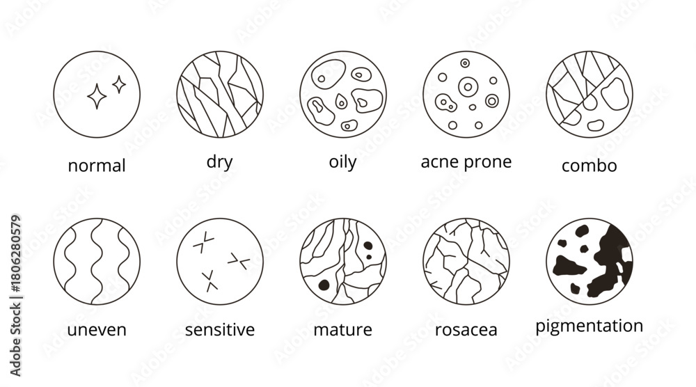 Skin types icons set. Line vector, editable stroke. Cosmetic skincare and dermatology symbols #1806280579