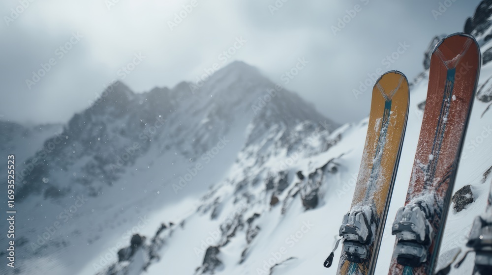 Skis standing upright in fresh snow on a scenic mountain slope, capturing the spirit of winter adventure and alpine sports in a peaceful snowy landscape under a clear blue sky #1693525523