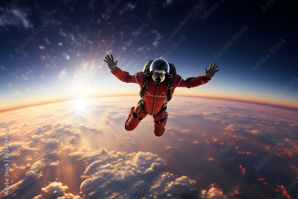 Skydiver in action from the space, Parachutist skydiving above the clouds from the space #624996134