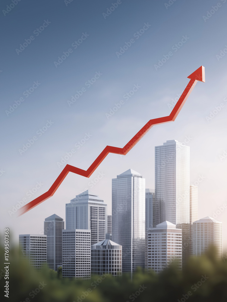 Skyline Ascent: A photorealistic illustration showcases urban development and growth, with a dynamic red arrow soaring above a modern cityscape, against a clear, azure sky and leafy foreground. #1769507363