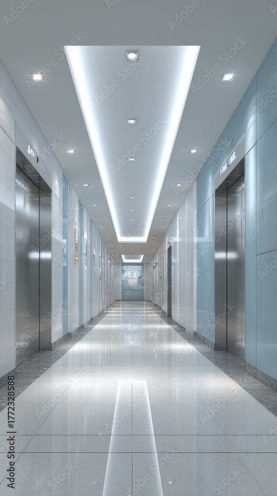 Sleek corridor with gleaming elevators, polished floor reflecting bright overhead lighting, embodying minimalist architectural design and futuristic workplace environment #1772328588