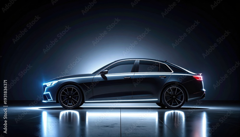 Sleek dark luxury sedan features illuminated glowing blue outlines while parked on reflective showroom floor in dark studio #1931836371