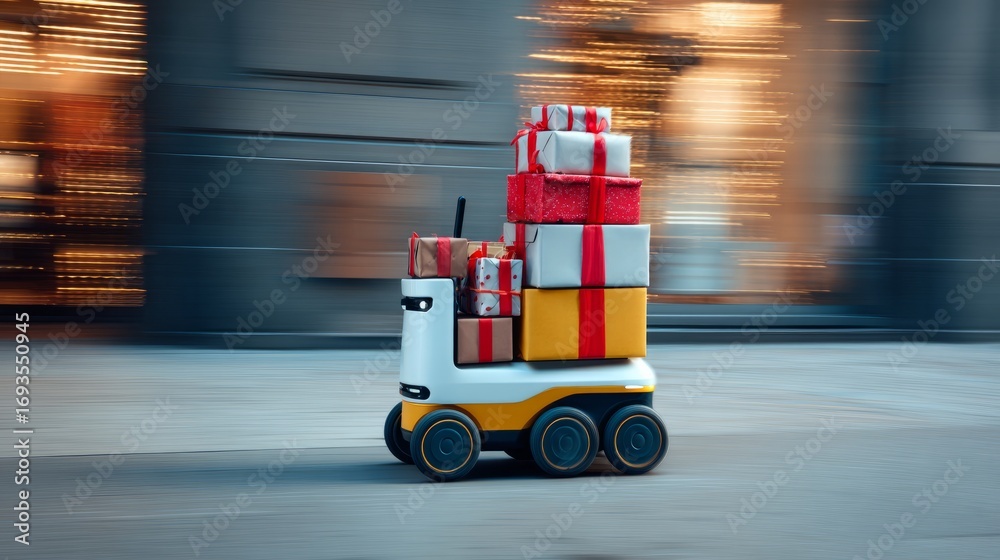Sleek delivery bot loaded with wrapped Christmas gifts, moving quickly on urban sidewalk, motion blur conveying festive fast-paced logistics #1693550945