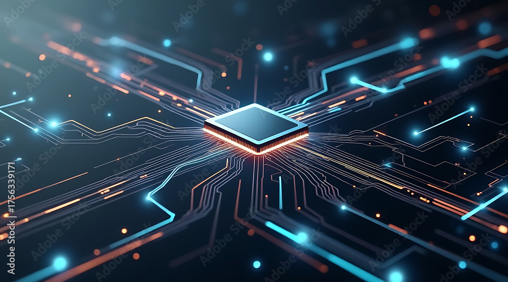 Sleek metallic microchip with holographic energy glowing on dark circuit board, symbolizing advanced technology and digital innovation #1756339171