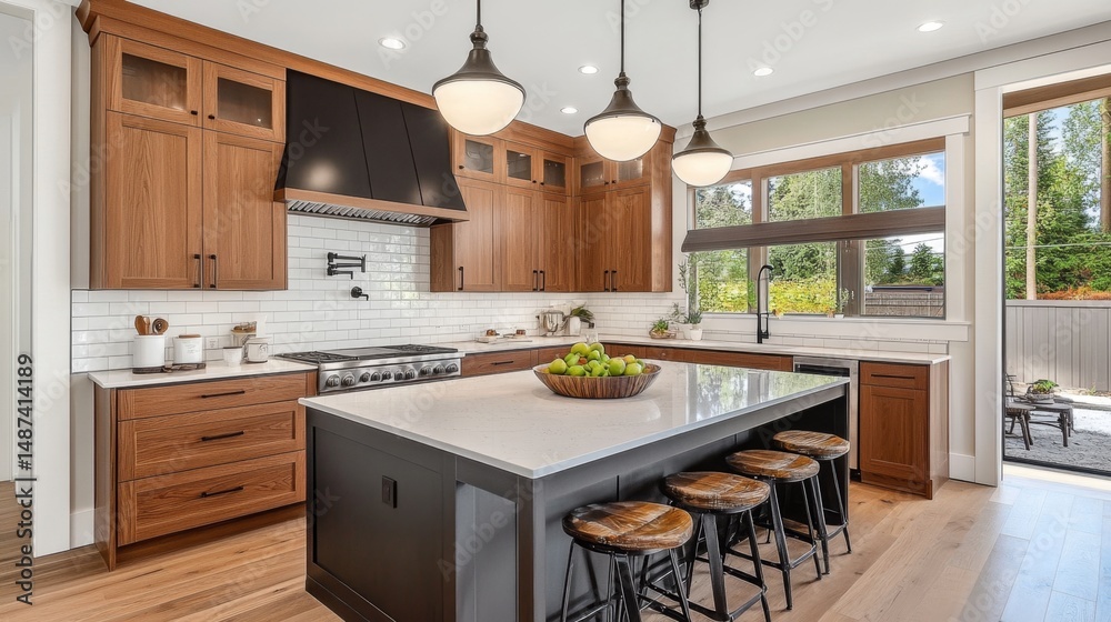 Sleek modern kitchen with wood cabinetry, large black island with seating, stainless steel gas range, pendant lights, bowl of fruit, white tiled backsplash #1487414189