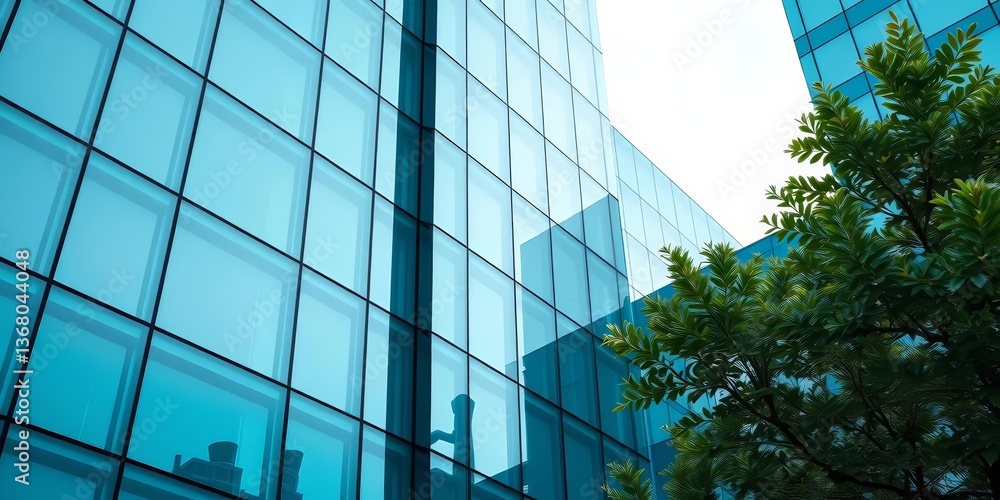 Sleek teal glass office building detail, ample negative space, business, reflection #1368044048