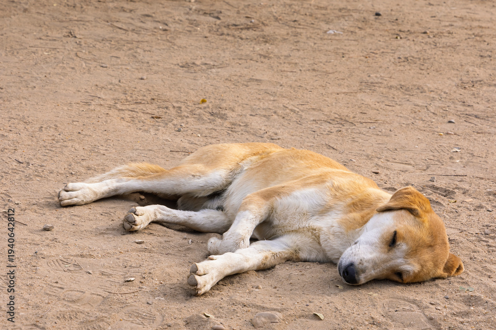 Sleeping stray dog resting on sandy ground in a Cairo, Egypt street under warm sunlight #1940642812