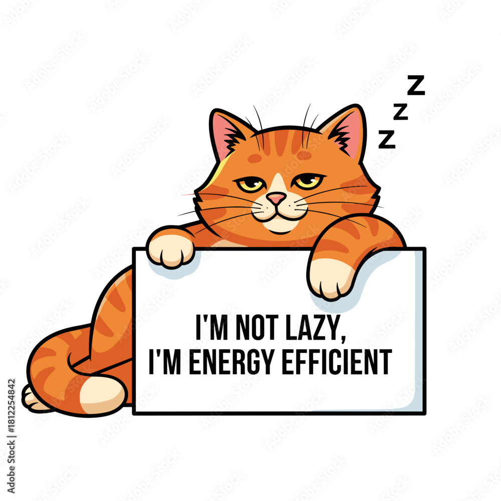 Sleepy orange cat holding a sign "I'm not lazy, I'm energy efficient" for social media memes, humorous content, and quirky greeting cards #1812254842